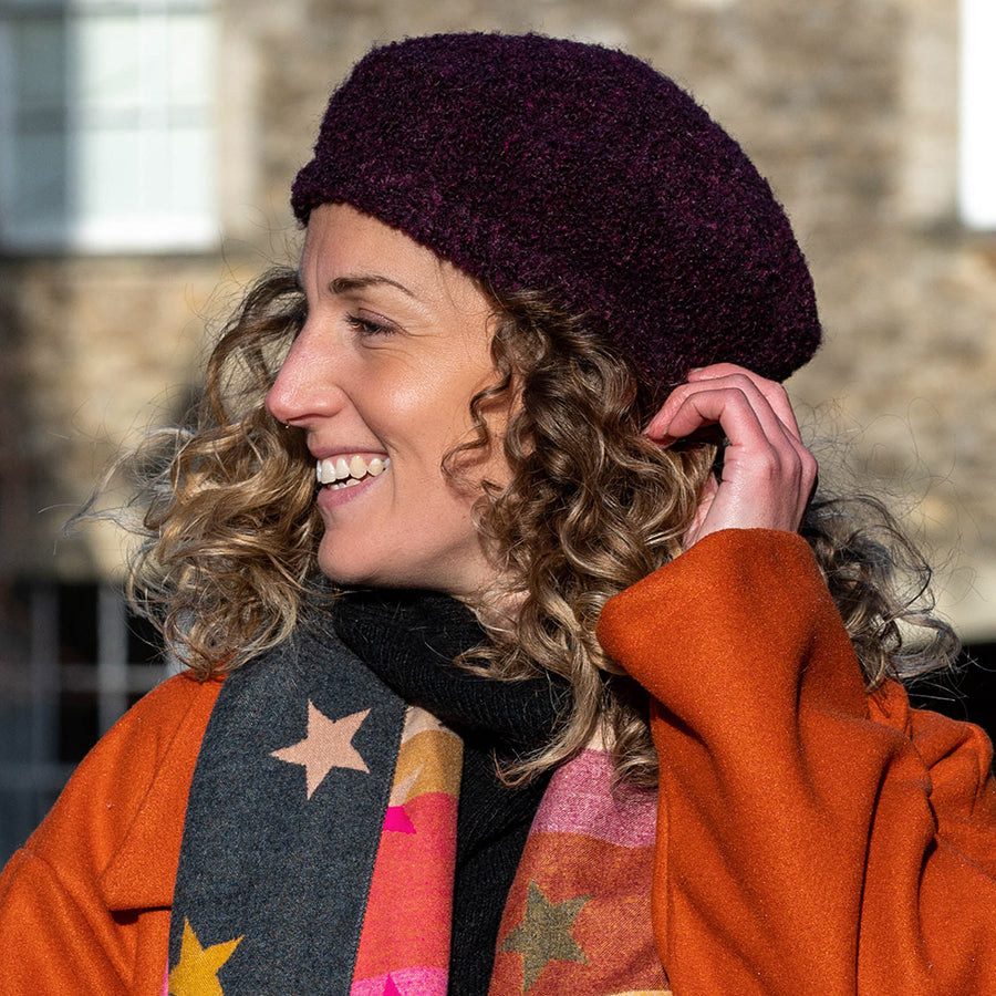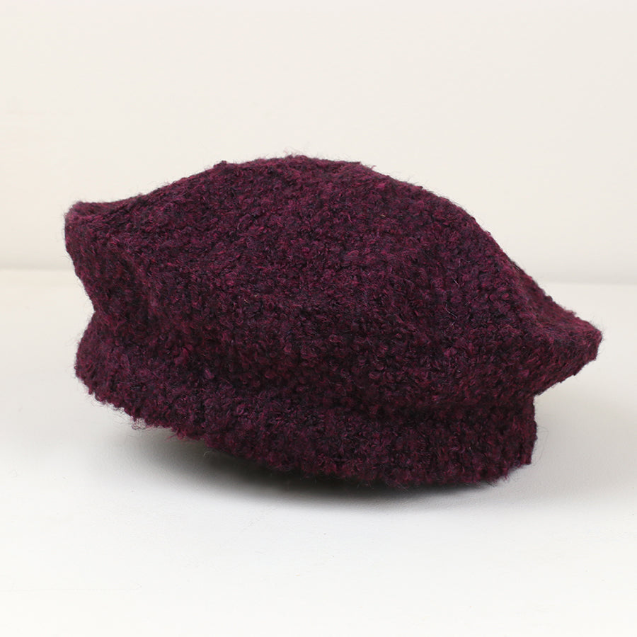 Recycled yarn and wool blend boucle beret in a rich red wine colour.
