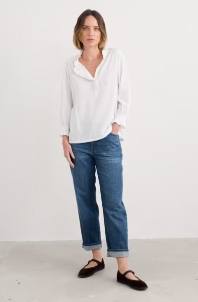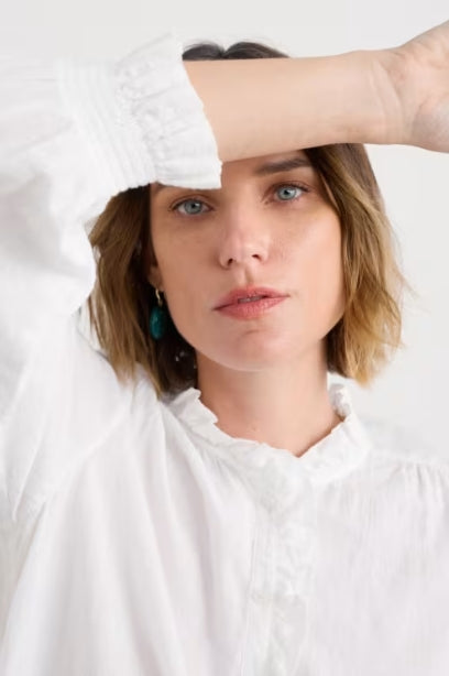 A versatile top made from a lightly textured blend of organic cotton and LENZING™ ECOVERO™ viscose, with a tonal check. Elasticated cuffs have a playful frill, echoing the frill around the button-down half placket. The easy fit is perfect for tucking in, wearing loose or under pinafores, and is created with delicate gathers from the yoke.