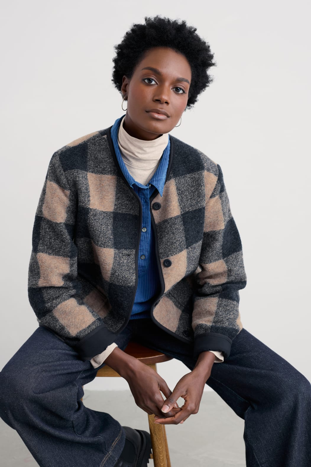 Your new go-to jacket, with a relaxed fit and a comfortable round neck. Our Merywen Jacket is soft to the touch, thoughtfully designed with sleek curved hems and neat bound edges. Wear it open or closed and layered through the seasons.