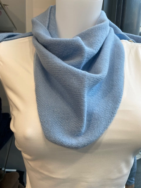 Pure wool triangle scarf in a lovely light blue. Style it as a neck wrap, shoulder drape, or headpiece—the possibilities are endless. Luxuriously soft and naturally warm.