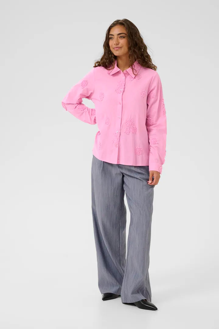 Lightweight cotton shirt will pop flower detail. Regular fit with slightly blousey sleeves.
