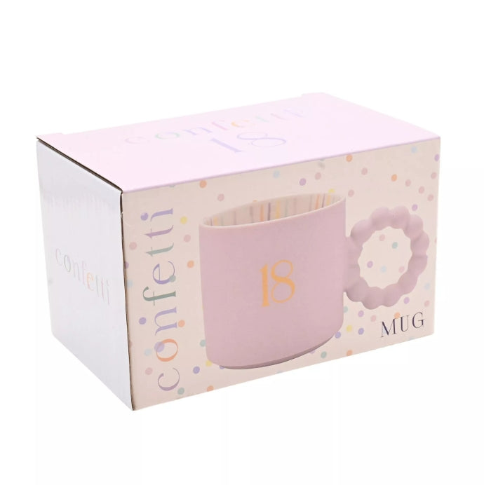 Celebrate a milestone 18th birthday with this charming Confetti Mug - 18. The pink ceramic mug features an "18" on the front, making it a perfect keepsake for the special day. The unique handle adds a playful touch to this celebratory gift.