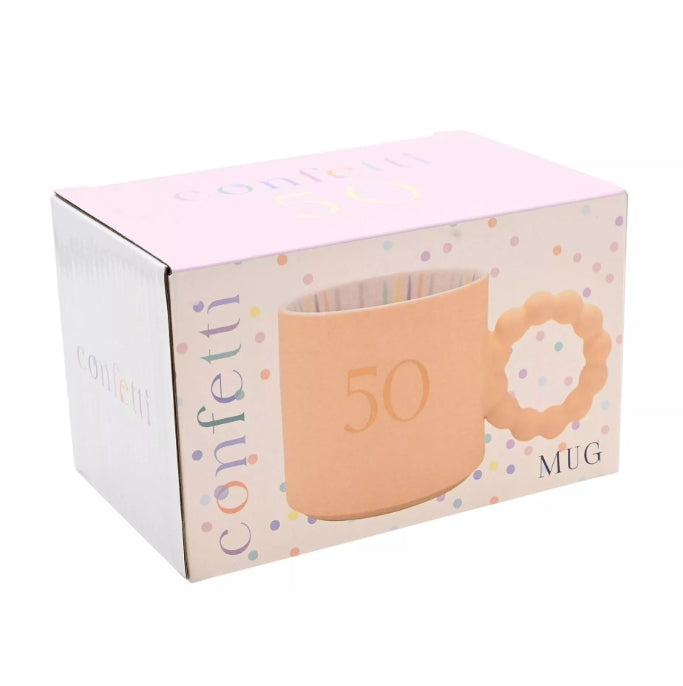 Celebrate a milestone 50th birthday with this charming Confetti Mug - 50. The pink ceramic mug features an "50" on the front, making it a perfect keepsake for the special day. The unique handle adds a playful touch to this celebratory gift.