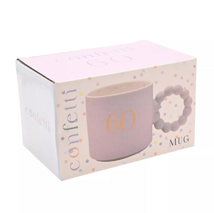 Celebrate a milestone 60th birthday with this charming Confetti Mug - 60. The pink ceramic mug features an "60" on the front, making it a perfect keepsake for the special day. The unique handle adds a playful touch to this celebratory gift.