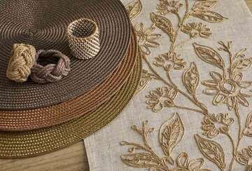 A polyester/linen table runner with an appliqued natural foliage design