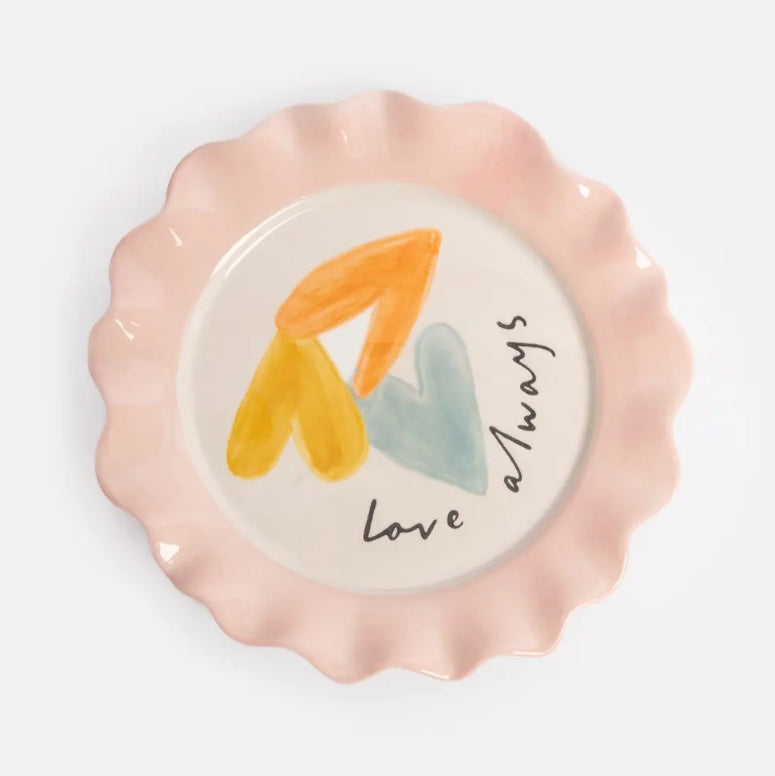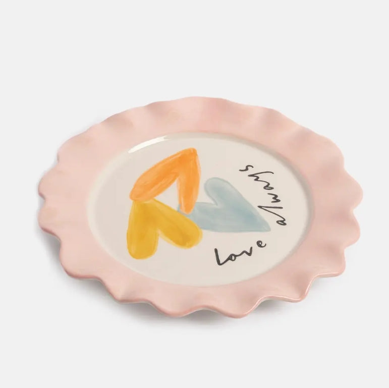 Hand painted glazed stoneware side plate with scalloped edges. Dishwasher safe. Please note these items are a hand finished item, and each will display their own unique characteristics. Slogans are unglazed to stand out as a design feature.