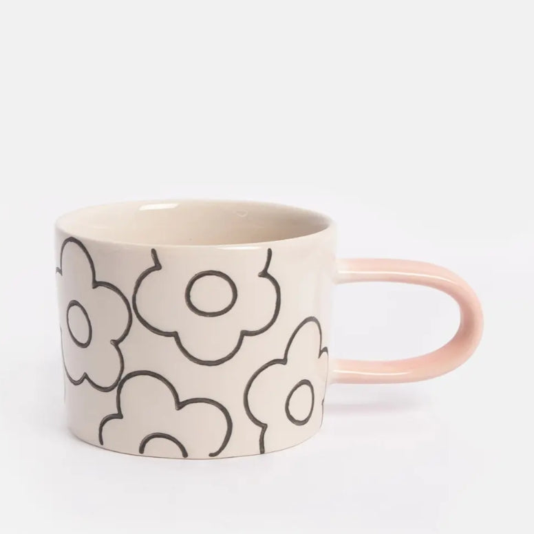 Hand painted glazed stoneware mug with an elongated handle. Dishwasher safe. Please note these items are hand painted, hand finished and each will display unique characteristics.