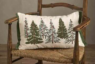 A rectangular cotton cushion with a green flange on the two shortest sides. Features an embroidered tree scene.