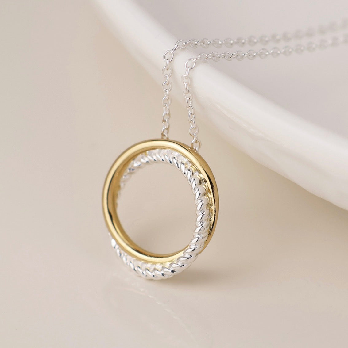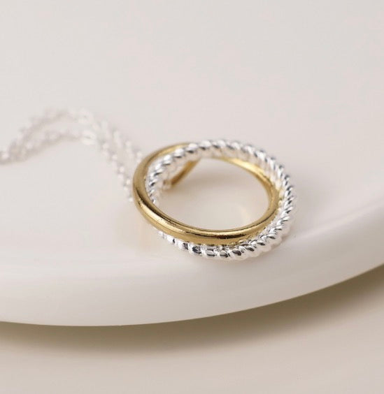 Sterling silver necklace with a silver and gold double hoop design.