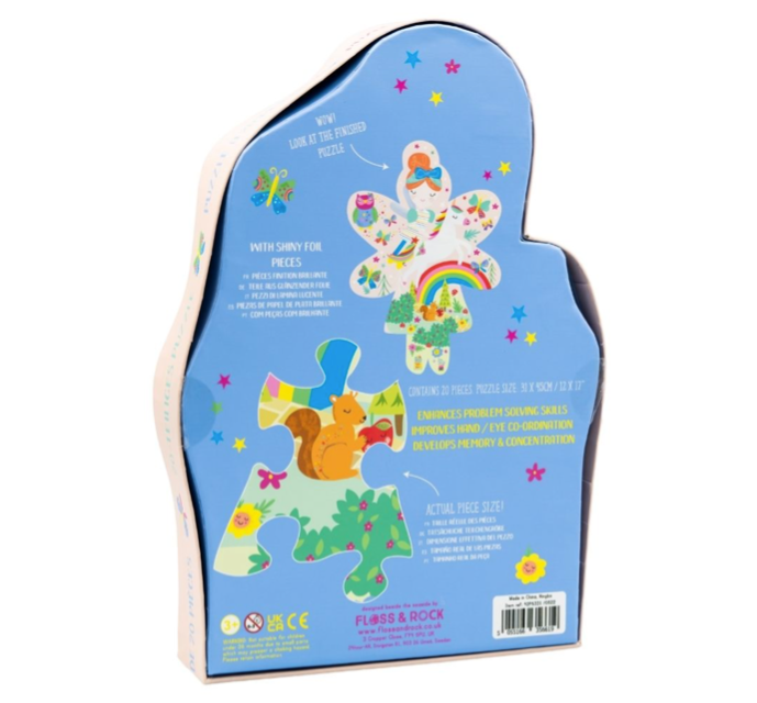 This fun shaped box contains 20 brightly coloured puzzle pieces that make an actual Fairy shaped puzzle with Unicorns, Fairies, Rainbows and more. Both the puzzle and the box have shiny foiled detail. Both the puzzle and the box feature shiny foiled details.