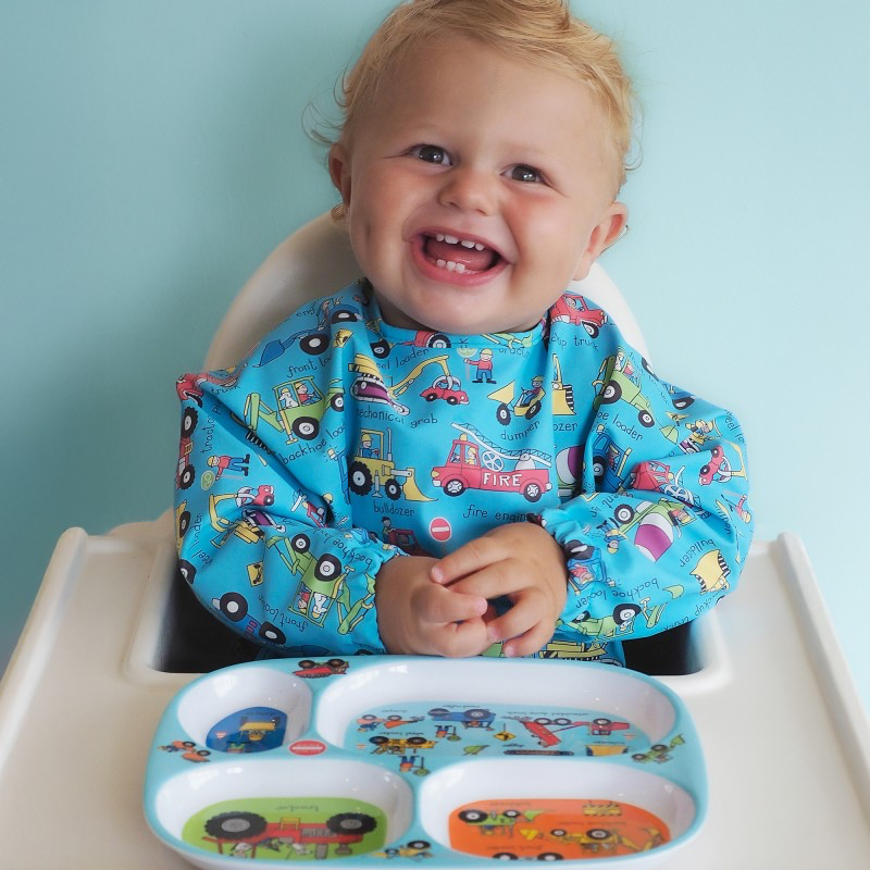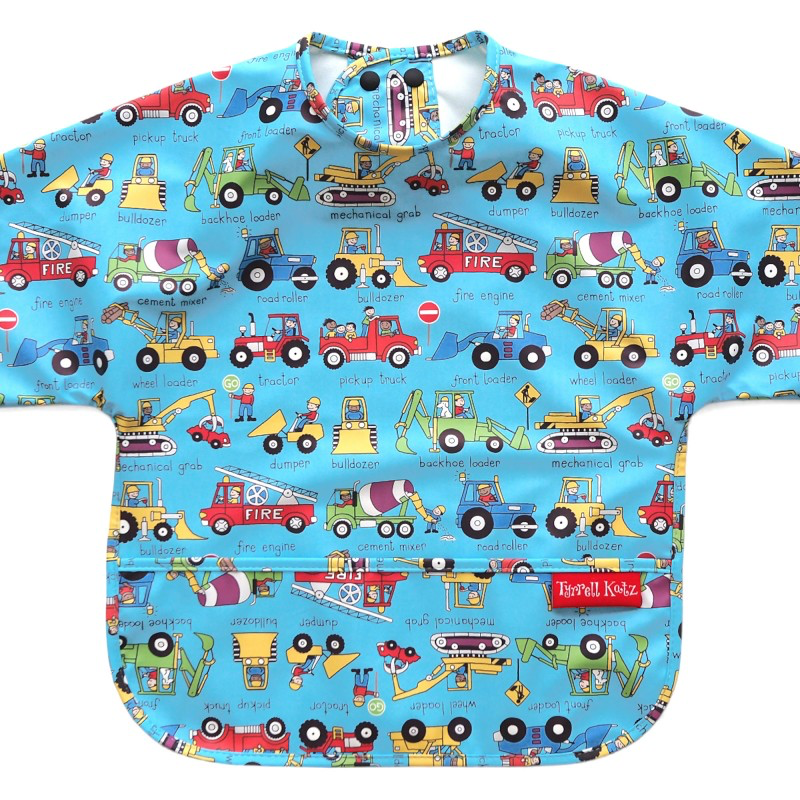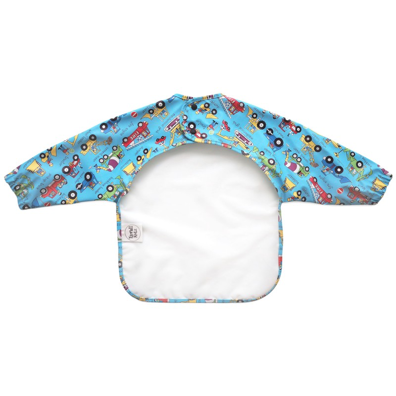 Long sleeve waterproof bib in Trucks print. Ideal for mealtimes and messy play activities. Super soft material ensures maximum comfort against delicate skin.