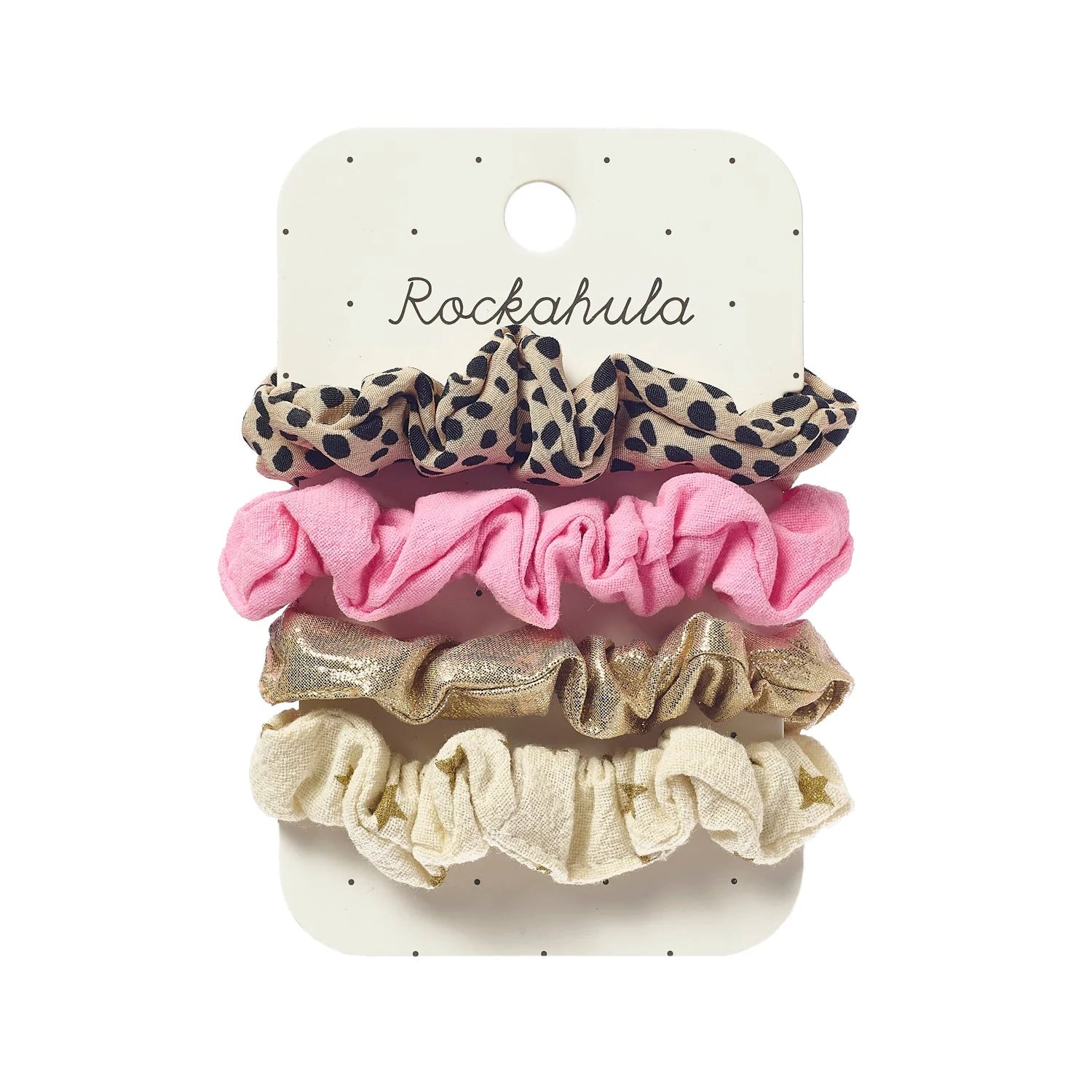 A pack of four roar-some scrunchies, each in a different gorgeous fabric. Featuring our signature leopard print fabric, a bright pink, a gold shimmer and a star scattered ivory print - these are the perfect scrunchies for little leopard lovers!