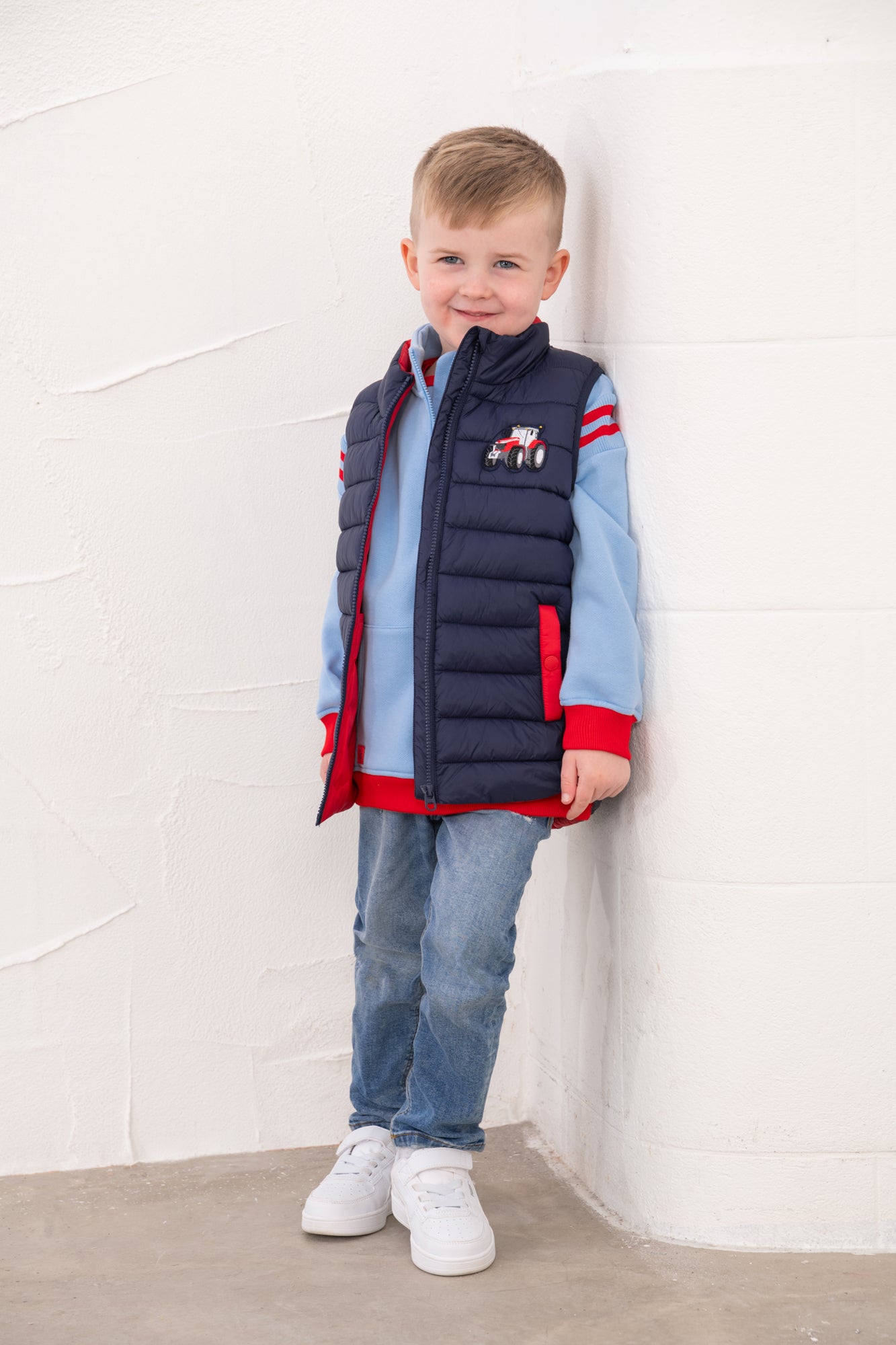 This charming navy puffer gilet brings a splash of countryside character to everyday layering. Featuring a cheerful red tractor embroidered on the front and matching pocket details, it's perfect for little adventurers who love farm life. The practical front zip makes it easy to slip on and off, while the stand-up collar provides extra warmth on chilly days. Lined with contrasting red fabric, it's as fun on the inside as it is on the outside. Ideal for outdoor play or cosy indoor moments.