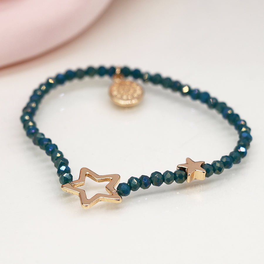 Dusky teal blue faceted bead bracelet with one large faux gold plated cut-out star and a small faux gold solid star.