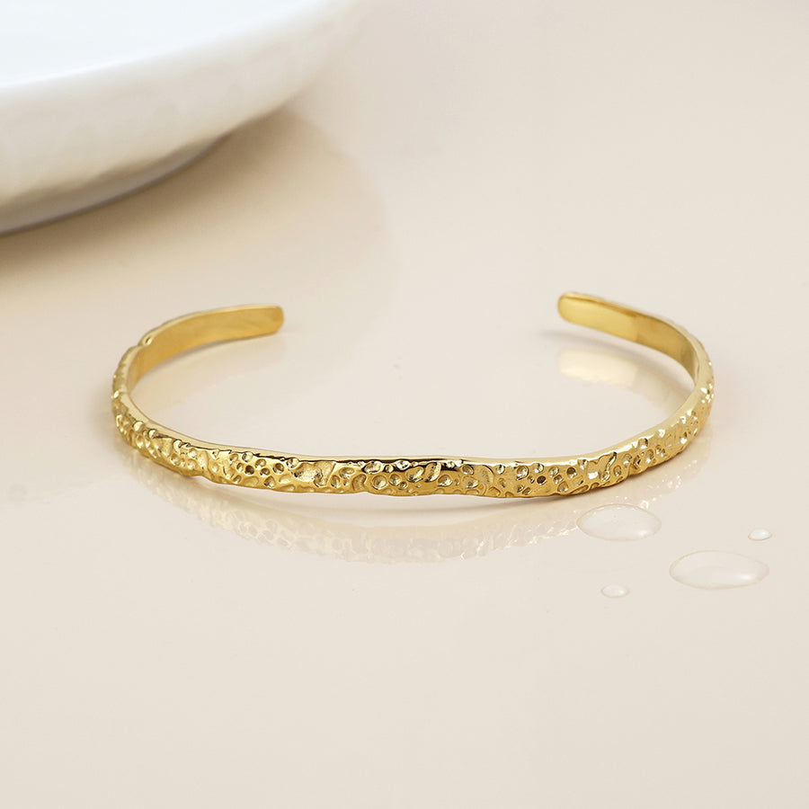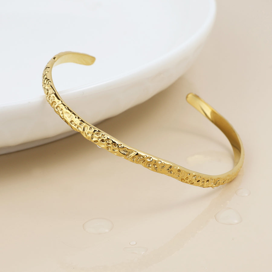 Stainless steel waterproof 14k gold plated fine band open bangle with a beaten texture.