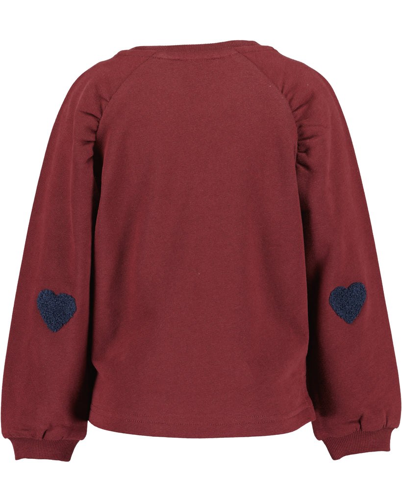 Girls burgundy sweater with heart detail. Ruffle shoulder.