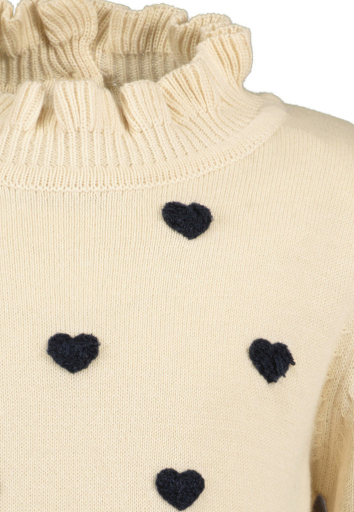 Girls cream sweater with scallop neck and fluffy navy hearts.