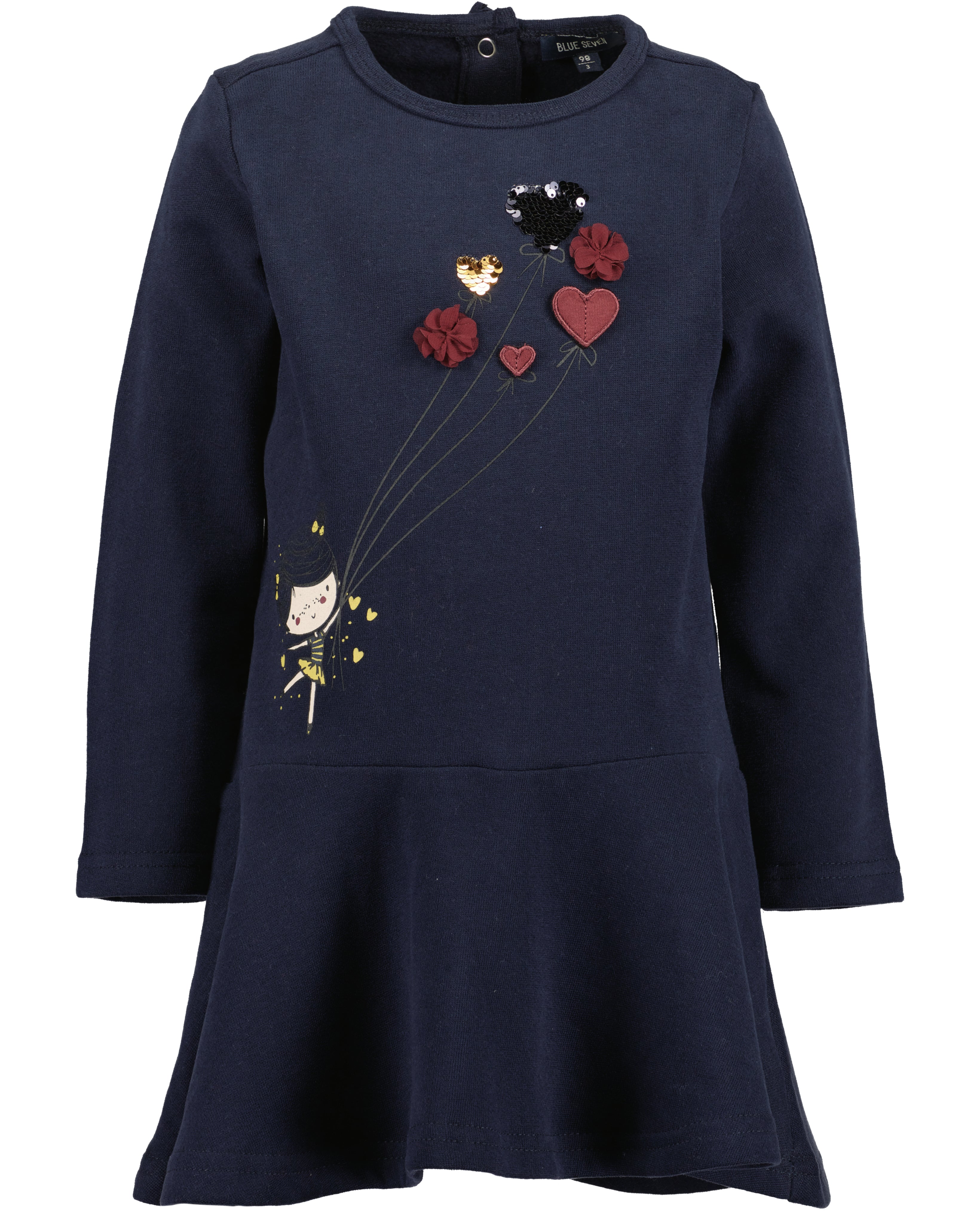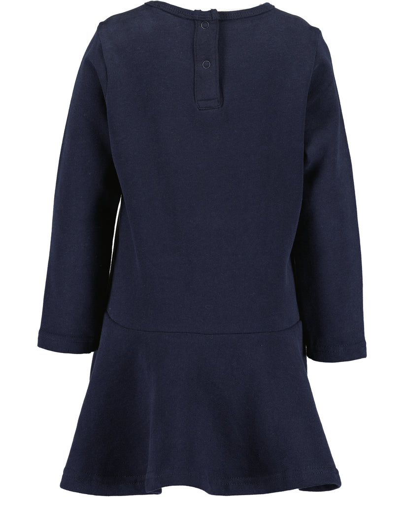 Girls navy sweater dress with sequin and embroidery detail. Ruffle skirt.