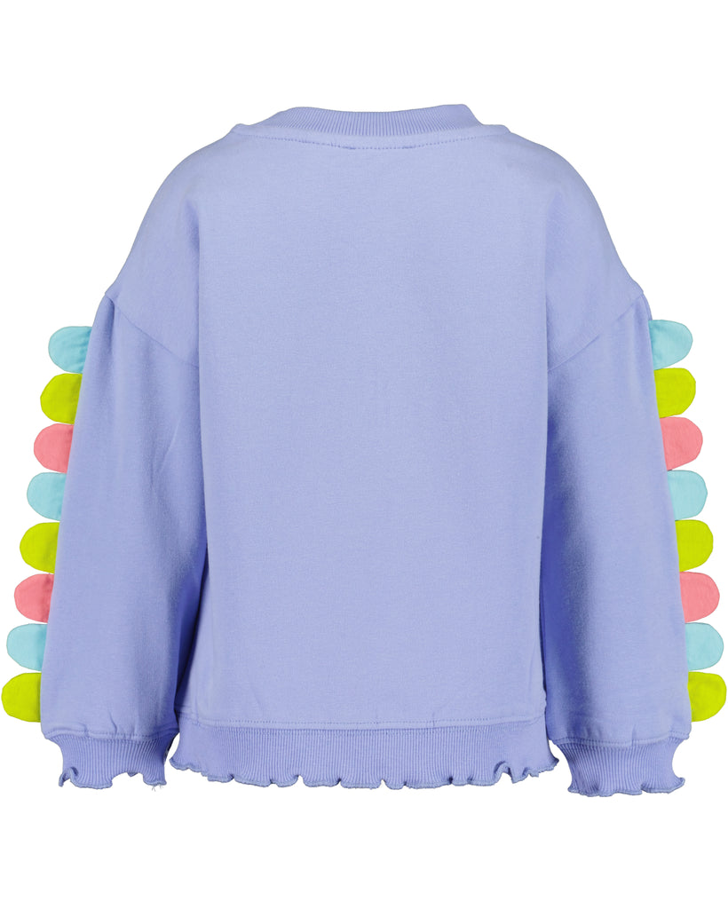 Girls purple sweater with sequin rainbow. Frilled hem.