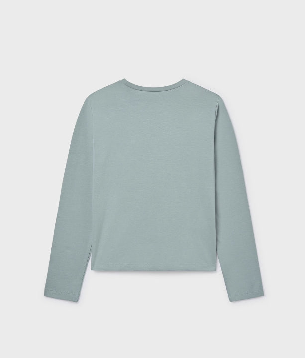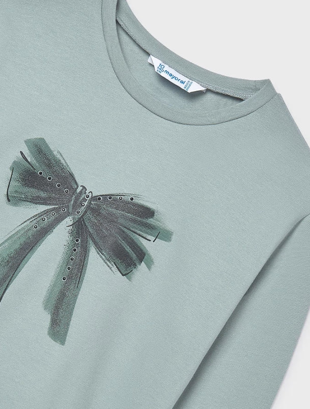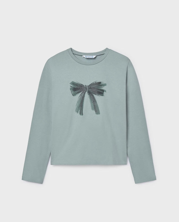 Girls long sleeve jade coloured t-shirt with lovely bow design.