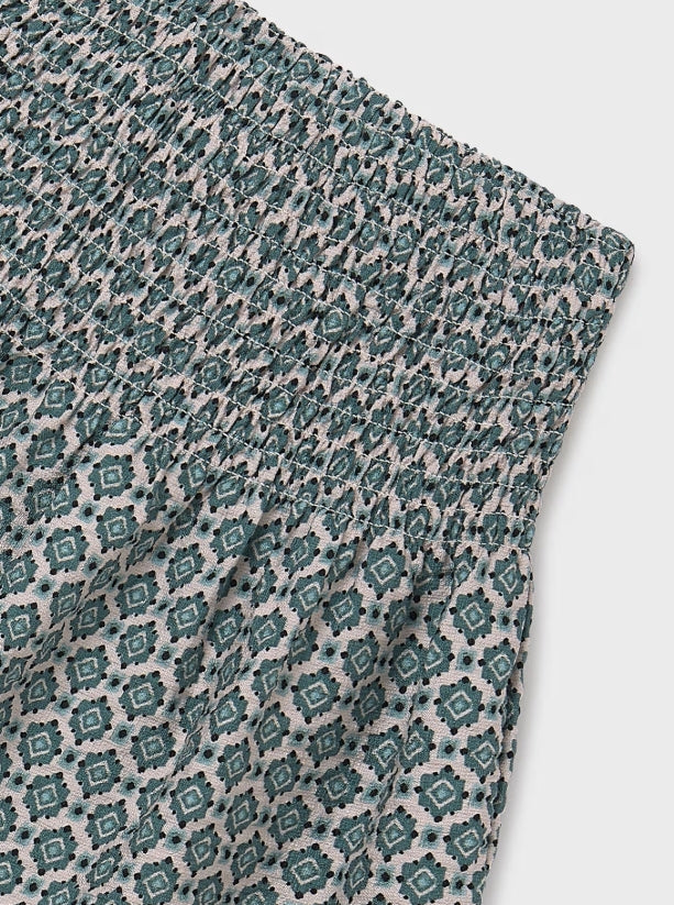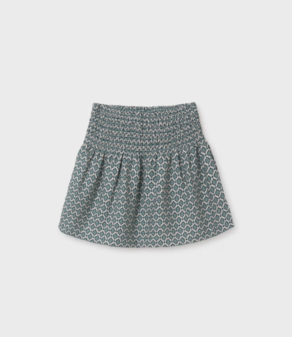 Skirt for girl. Elasticated waistband. Puckered front. This model has honeycomb detailing. Patterned design.