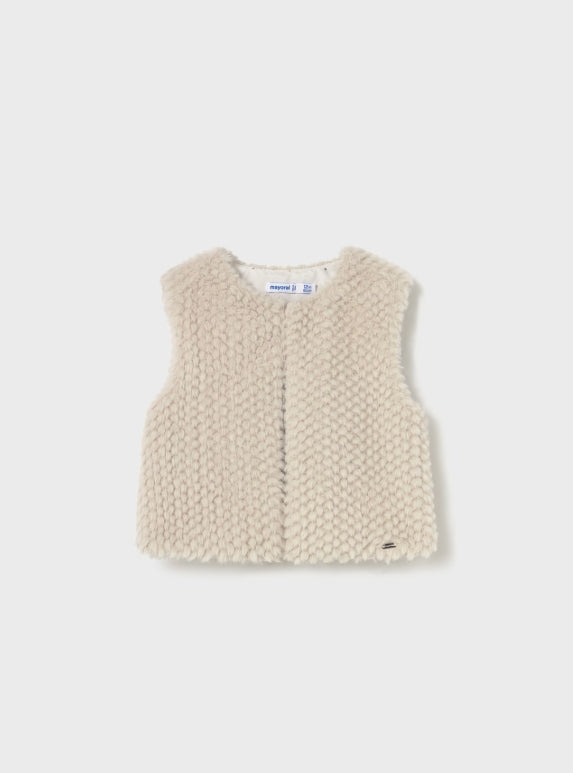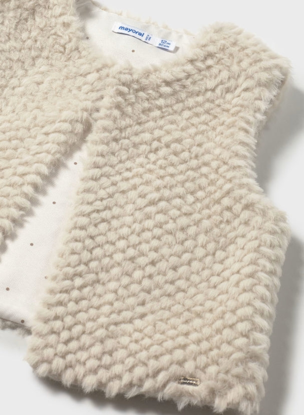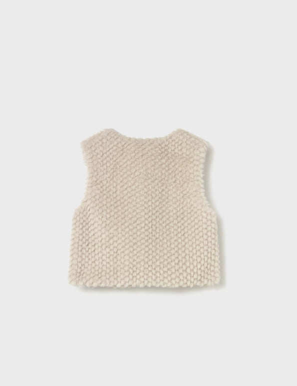 Gilet for baby. Fastening with hidden clasps for a quick fit. Soft and smooth outer faux fur fabric. Soft polyester inner lining.