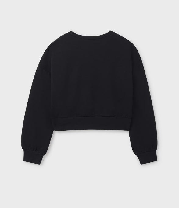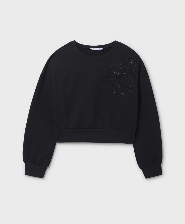 Long sleeved sweatshirt for girl. Jumper features a round neck and sequin flower detail.