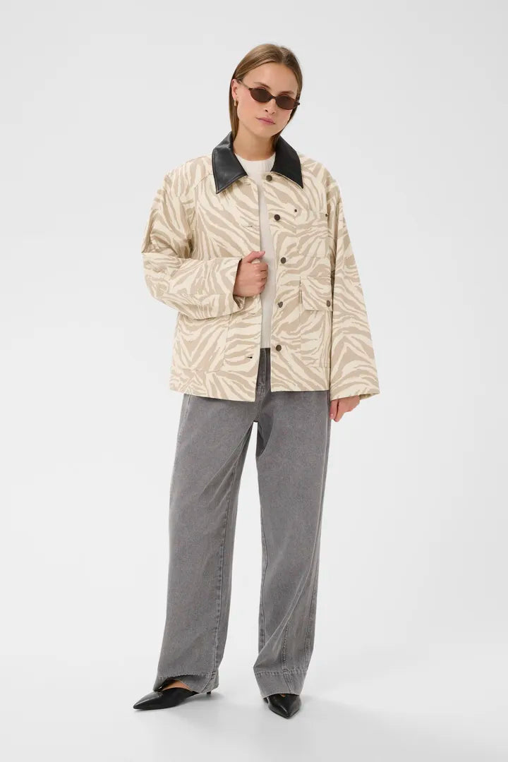 Zebra print jacket with a straight, boxy fit, structured texture, and bold contrast collar. Features a button closure, long sleeves, and large front flap pockets.