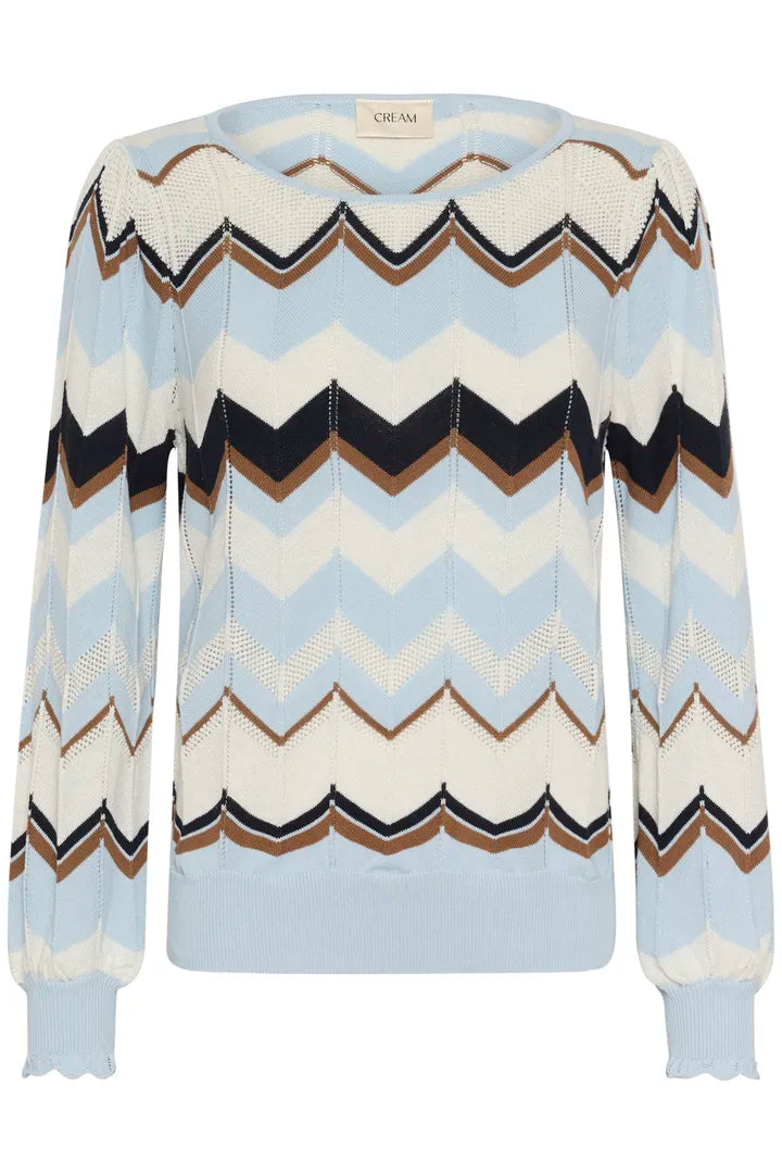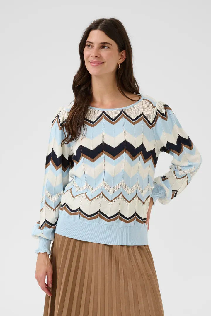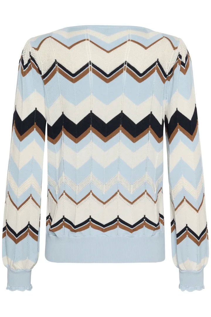 The Netes Pullover is a versatile piece to add to your everyday wardrobe with its striking blue zigzag pattern. This cosy sweater combines comfort with eye-catching style, perfect for layering or wearing solo.
