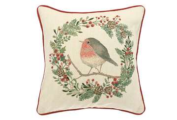 Square cotton cushion with an embroidered robin design sitting centrally within a a Christmas wreath. Zip closure for easy removal of the pad.