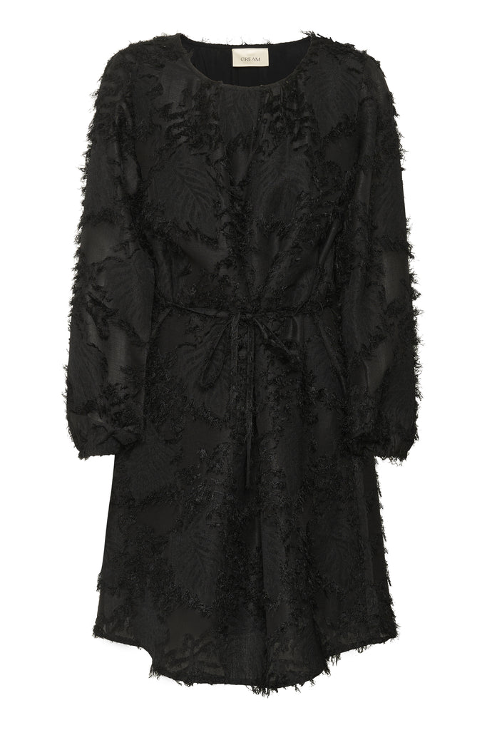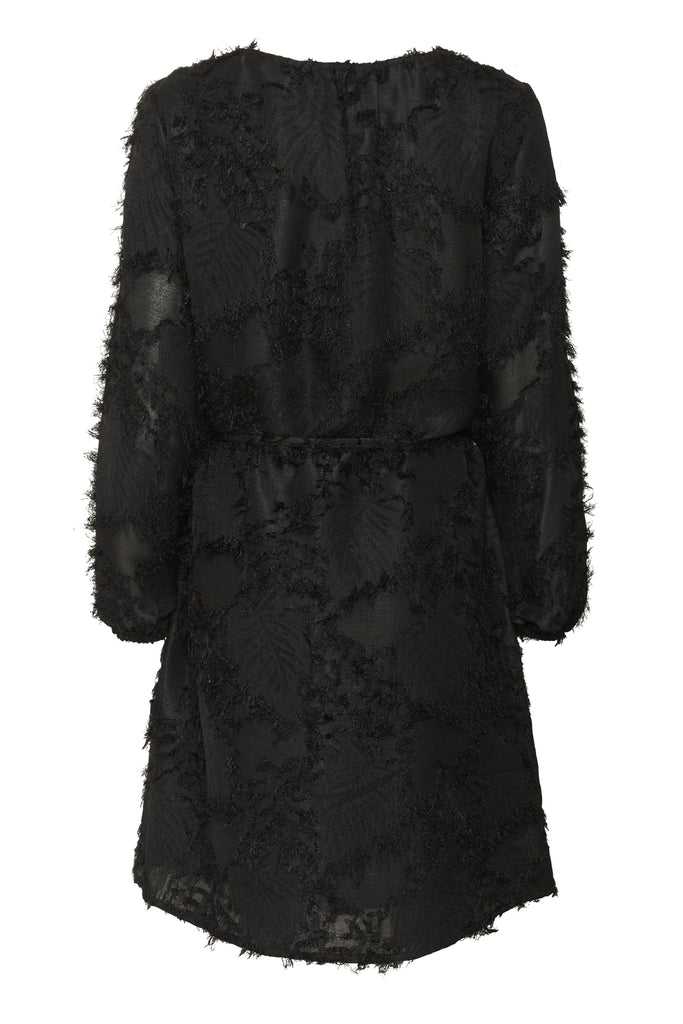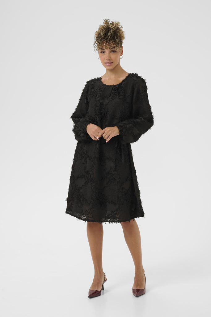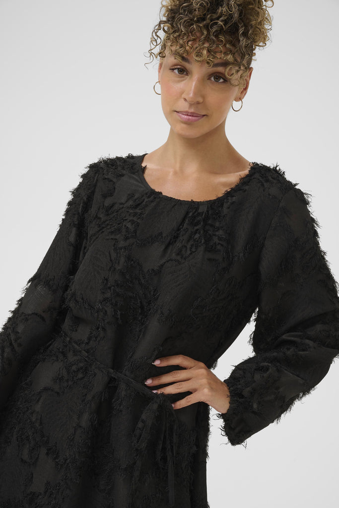 The Freja Dress features a flattering black knee-length A-line design with delicate leaf print details that bring a touch of nature-inspired elegance to your wardrobe. Its versatile shape offers both comfort and style, making it an ideal choice for everyday wear or special occasions.