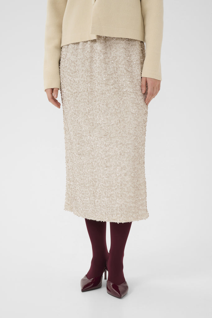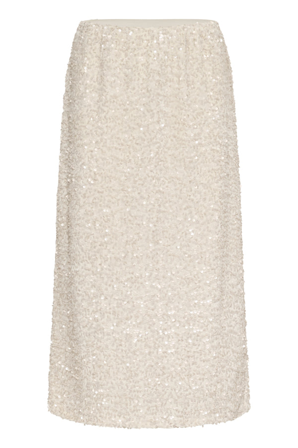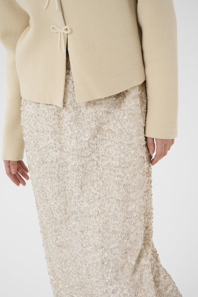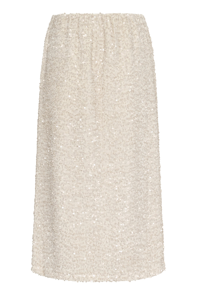 The Nali Skirt in a refined cream shade features delicate sequin detailing that adds a subtle shimmer, perfect for elevating both day and evening looks. Its elegant design pairs effortlessly with a variety of tops, making it a versatile addition to any sophisticated wardrobe.