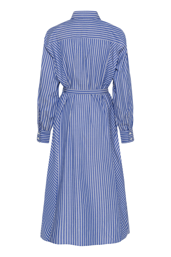The Calken Shirt Dress features crisp blue pin stripes and a flattering belted waist. This versatile piece transitions seamlessly from work to weekend, offering both style and comfort in one effortless design.
