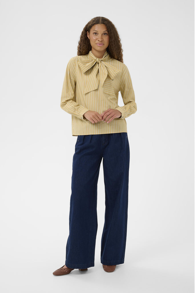 The Otisha Blouse in a cheerful yellow features pin stripes and a removable striking large bow detail at the neckline. Perfect for adding a confident pop of colour and personality to your everyday looks.
