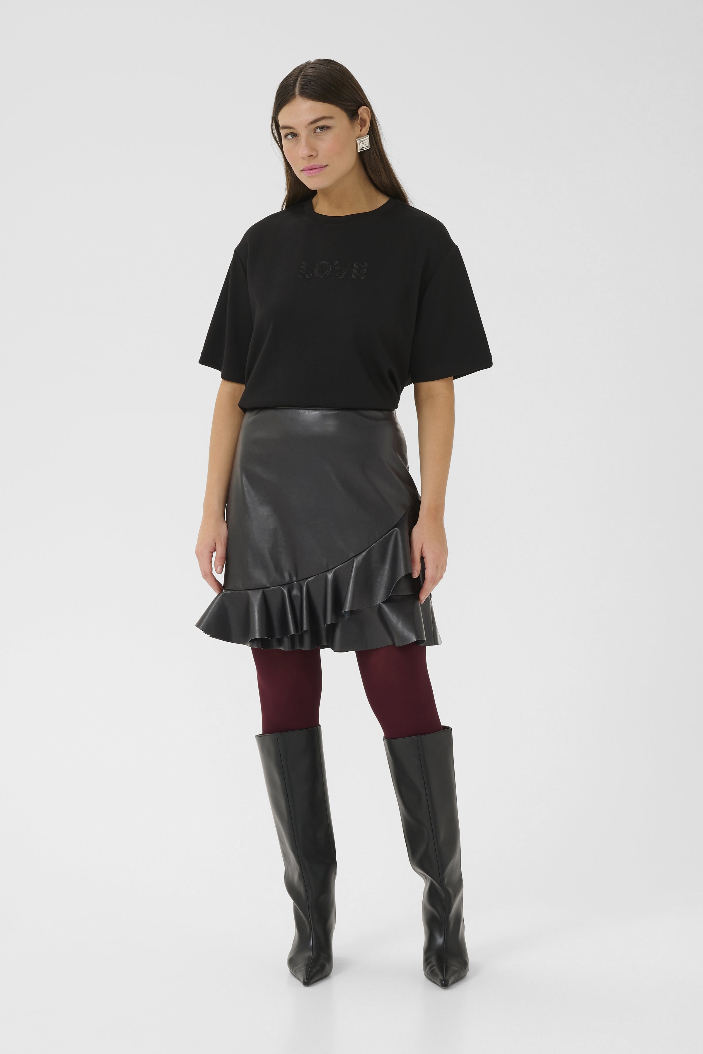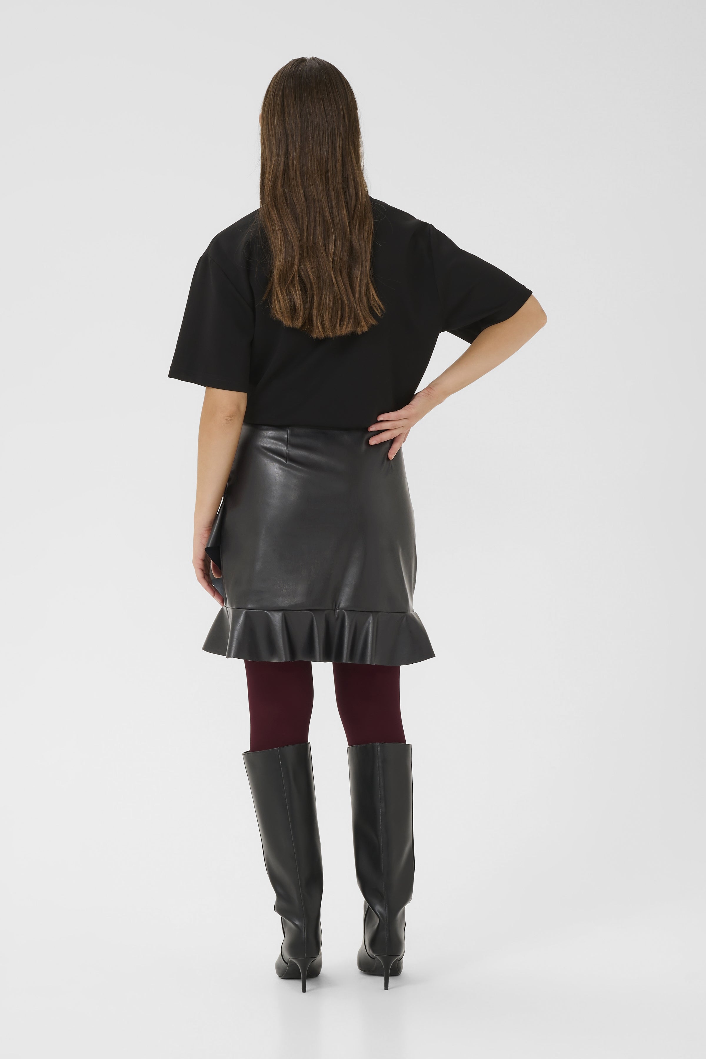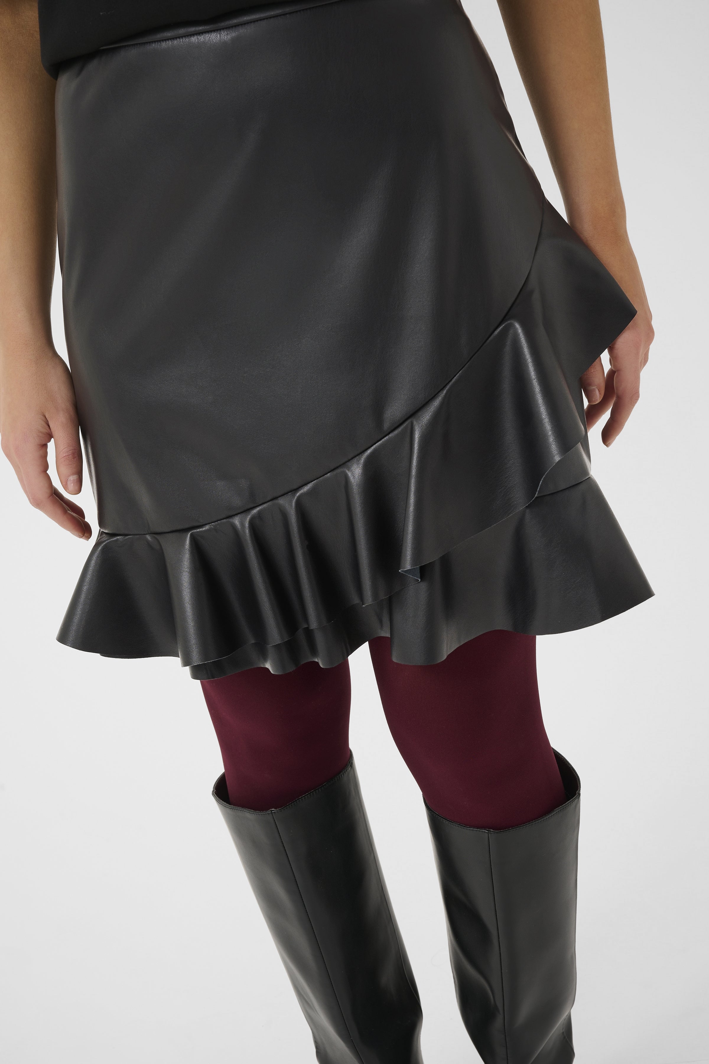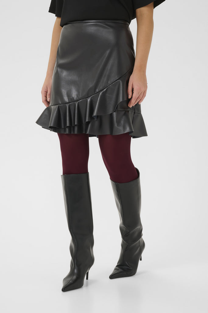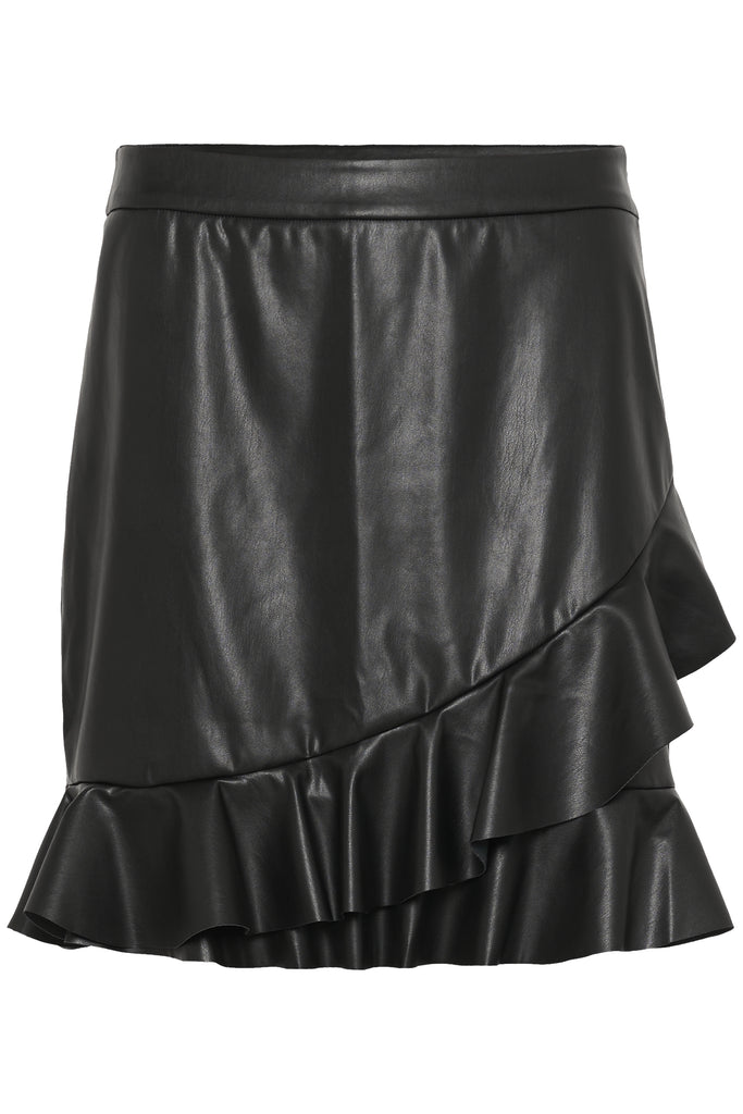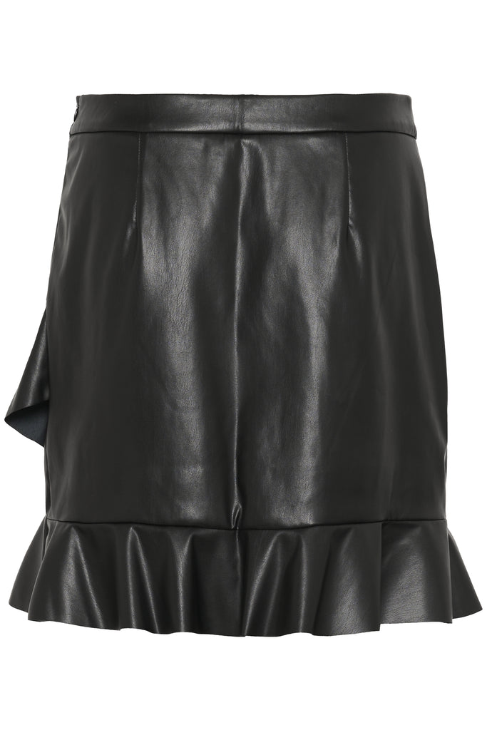 Make a statement with the Teda Mini Skirt, featuring a sleek leather-look finish paired with delicate ruffle accents. The faux leather delivers a sophisticated look, while the ruffles introduce texture and movement that catches the eye. Layer it with tights and ankle boots or go bold with heels.