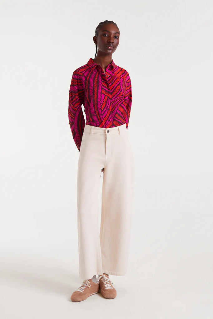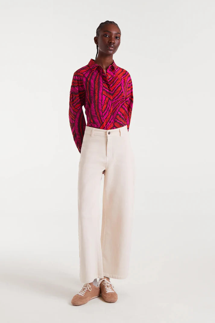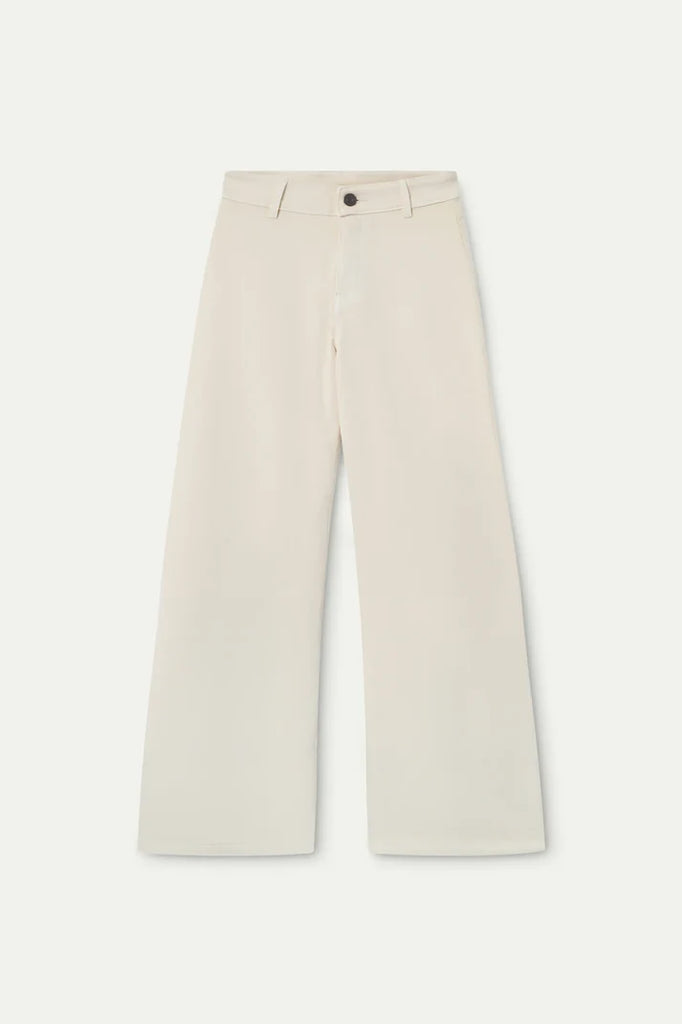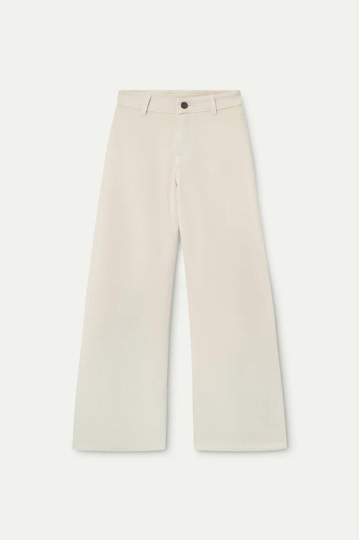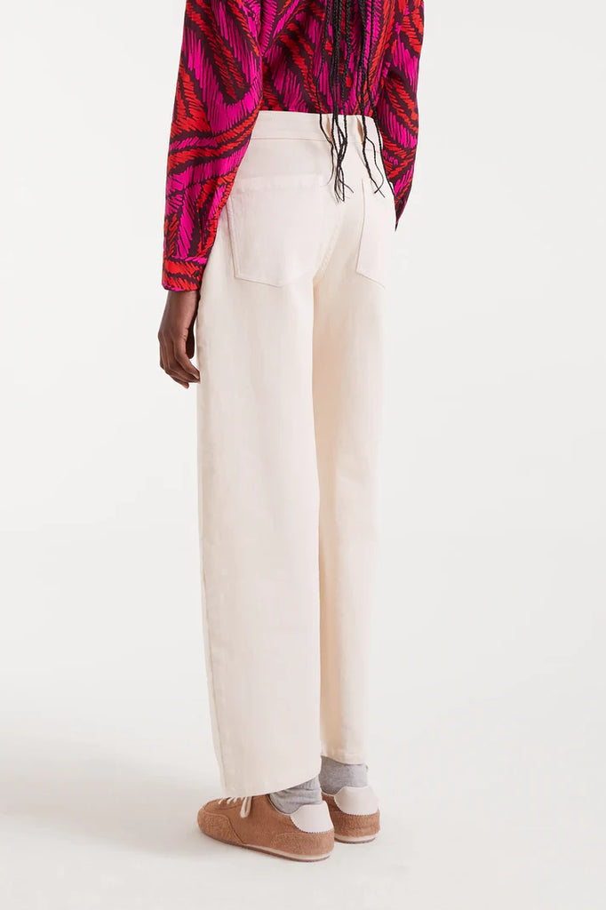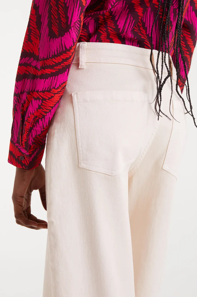 White stretch denim jeans. High rise and straight leg. Front zip and button closure. Side and back pockets. The model is 178 cm tall and is wearing a size S.