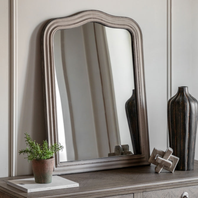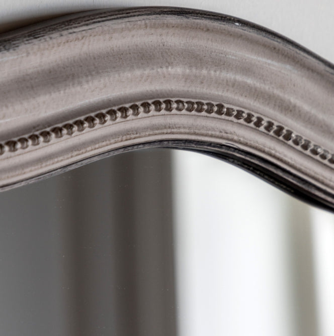 Handcrafted in wood with refined beadwork detailing, this elegant mirror brings classical, timeless charm to a room. The soft mid grey frame is highlighted by a gently distressed hand painted finish. With an effortless, relaxed style, the mirror suits traditional and coastal inspired interiors with ease.