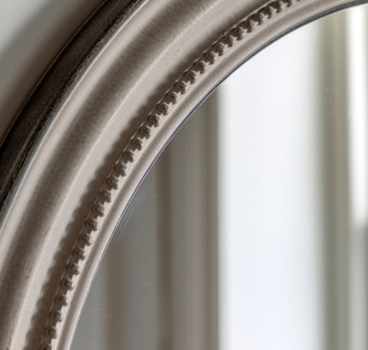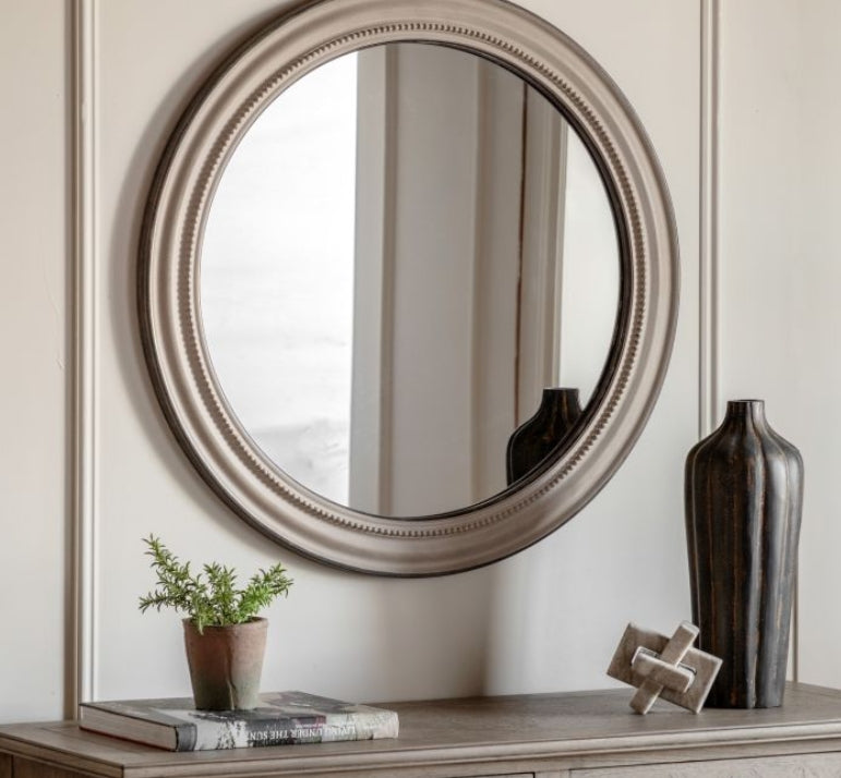 Ideal for adding understated elegance and charm to a room, this round mirror suits traditional and coastal inspired interiors alike. The handcrafted wooden frame features refined gesso beadwork detailing and a soft mid grey tone, highlighted with a hand painted, gently distressed finish.