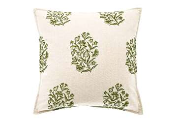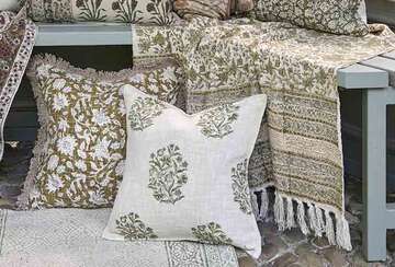 100% cotton cushion, hand block printed by skilled artisans using hand carved wooden blocks that give each piece unique characteristics. Feather pad.