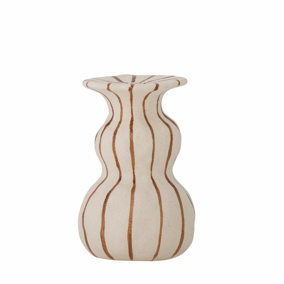The Byron Candle Holder by Creative Collection is a stoneware piece with a reactive glaze. It features an hourglass shape with wavy brown stripes on a soft beige base. The matte, textured finish adds depth and character. Small variations in pattern and colour intensity may occur, making each piece unique.