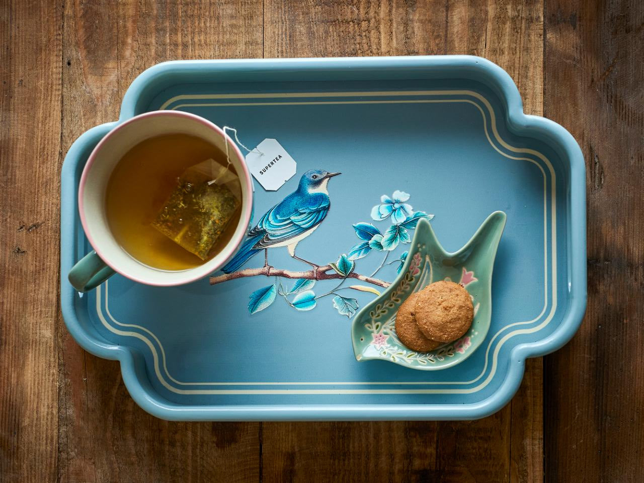 The Meggie Tray by Creative Collection is a practical MDF piece in a blue finish, featuring a detailed illustration of a bluebird on a flowering branch. Framed by a pale cream edge, the design combines decorative appeal and everyday function across various interior settings.
