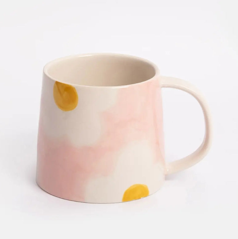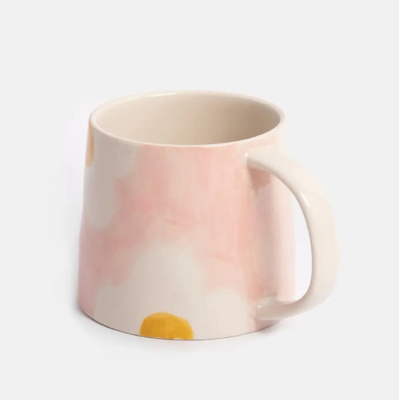 Hand painted glazed stoneware large mug in a pink and mustard flower design. Dishwasher safe. Please note these items are hand painted and each will display unique characteristics.