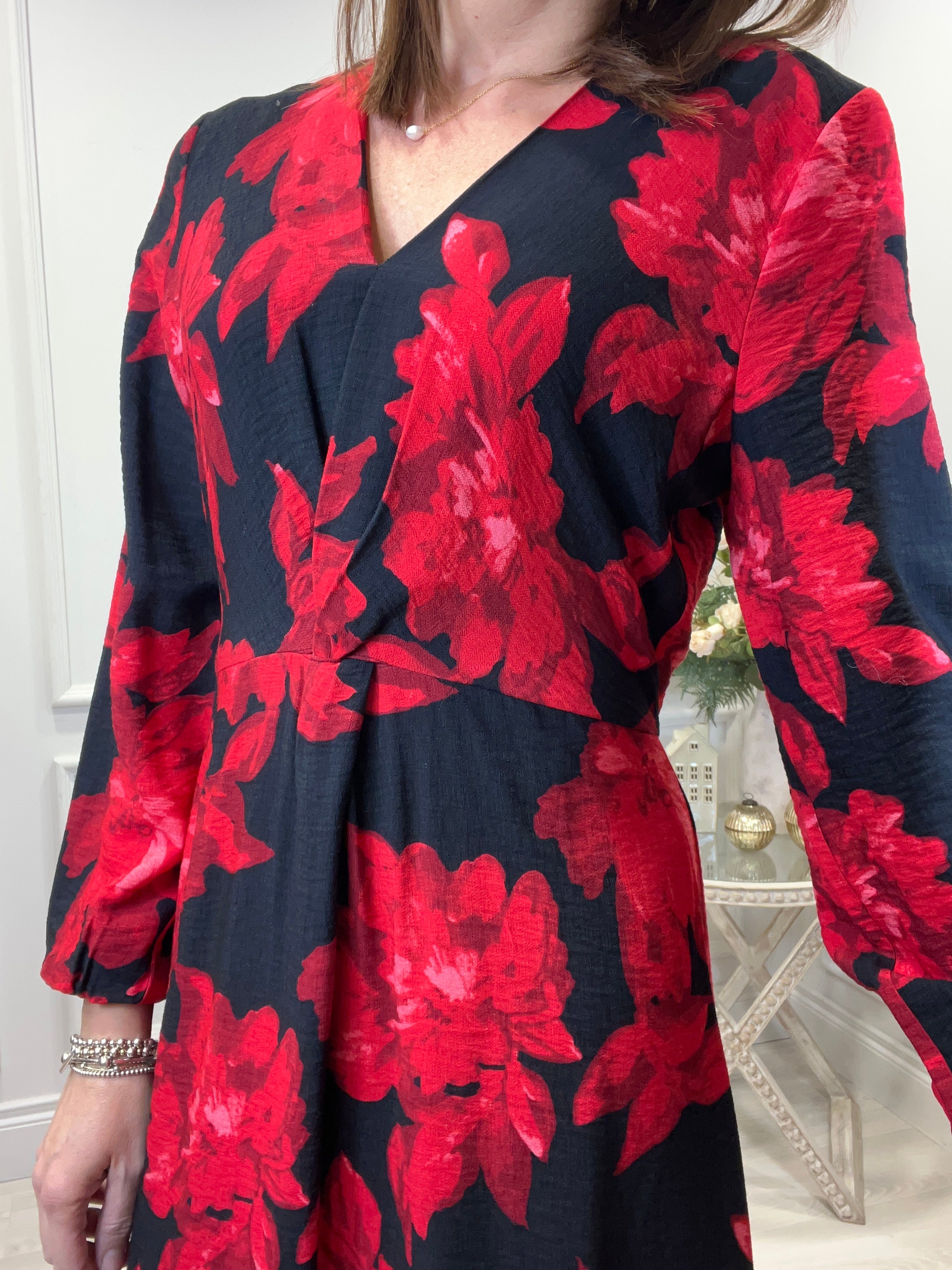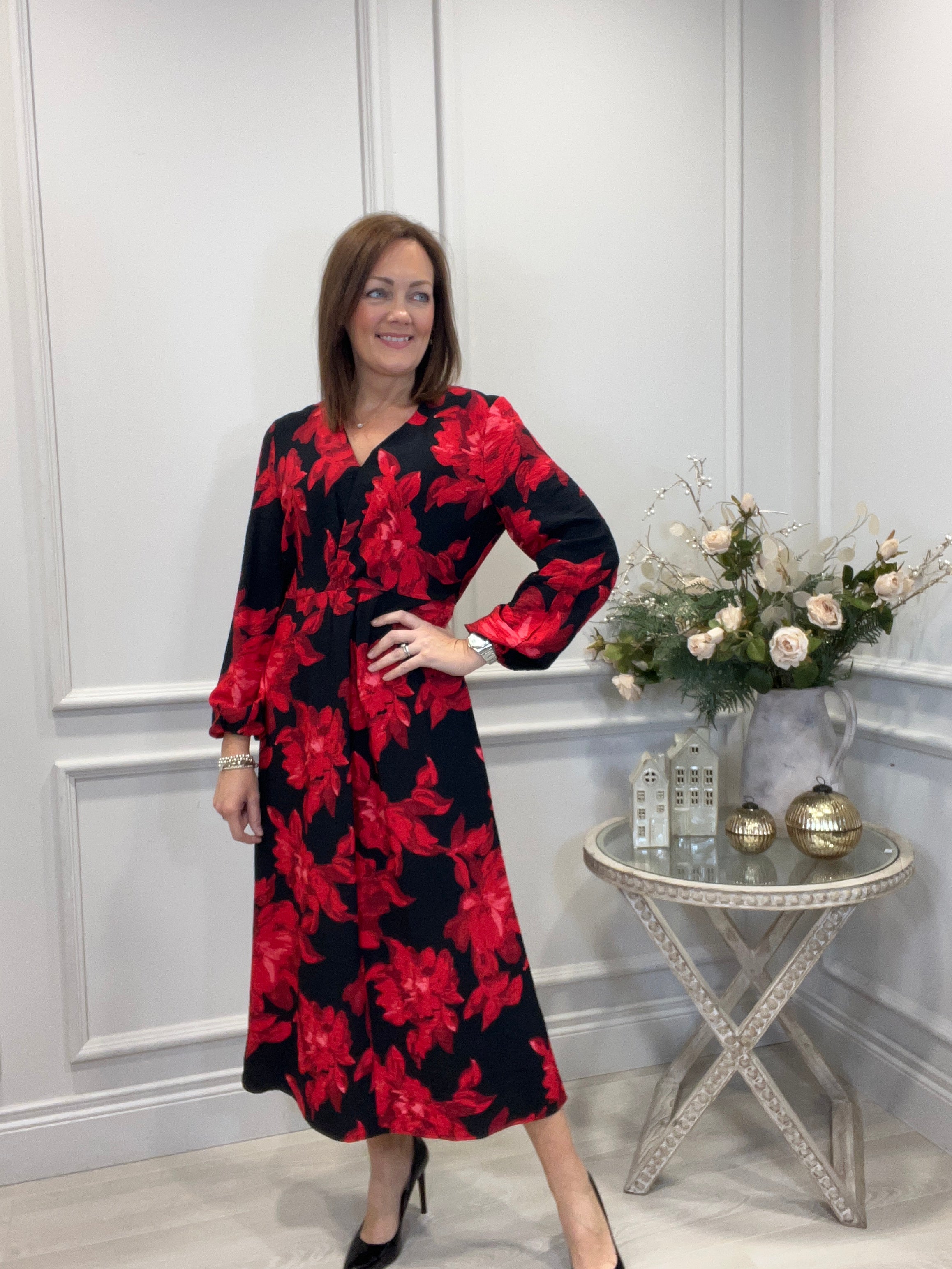 This Lysine Dress features a classic black base adorned with a striking red floral pattern, creating a timeless and elegant look. Its midi length offers a flattering fit suitable for various occasions, from casual outings to special events. Designed to complement your natural style, this dress combines comfort and sophistication effortlessly.