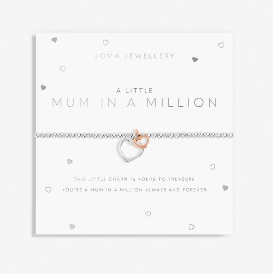 Our A Little 'Mum In A Million' Bracelet features a silver-plated design that will dazzle with every movement. Featuring a stretch-bead style and a sparkling silver-plated heart charm, wrapped around one of our stylised cards and framed by a sweet poem. The perfect every day gift, and mother’s day gift!