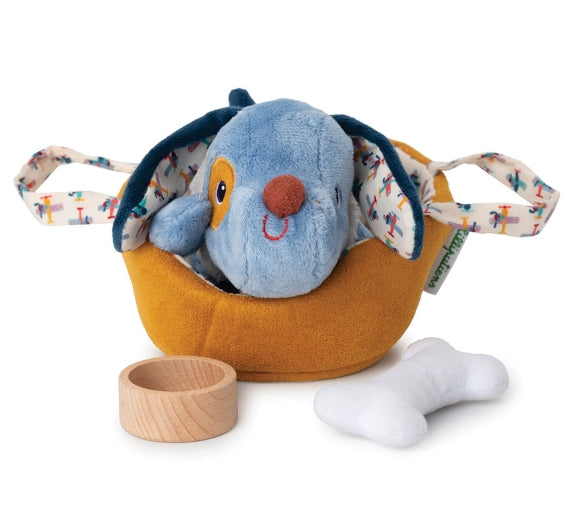 This cozy basket welcomes the adorable puppy Jules. With his soft fur, he's waiting to be pampered. Beside him are a bowl and a chew bone, ready to be gnawed. The child puts his little jacket on him and gently strokes him. Jules barks happily as he's being cared for