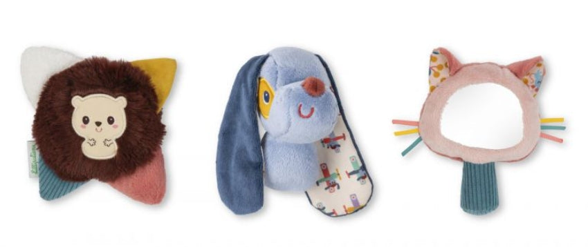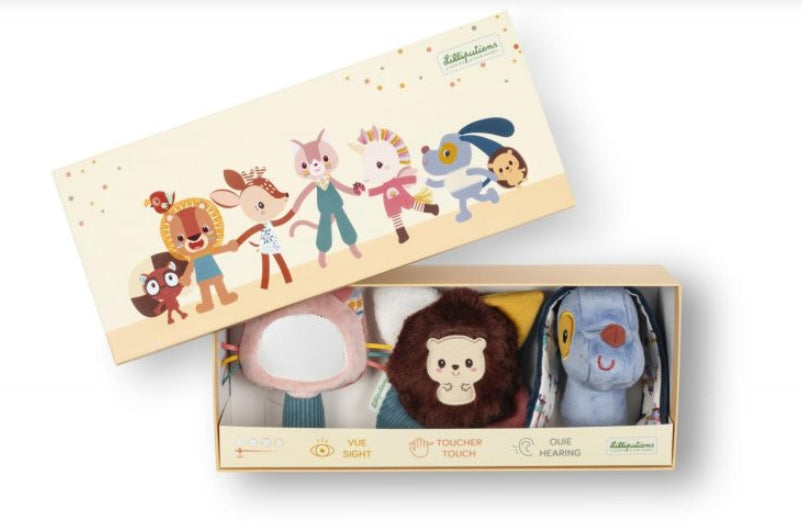 Awaken your little one's senses with this set of three adorable characters. Jules the dog stimulates hearing with a fun crinkly sound. Jeanne the cat encourages visual discovery while sparking curiosity. Finally, Leon the hedgehog offers a unique tactile experience to develop the sense of touch. Presented in a beautiful gift box, these sensory rattles make the perfect gift for a newborn