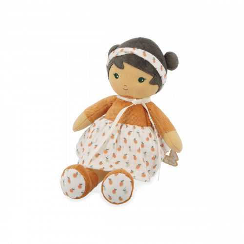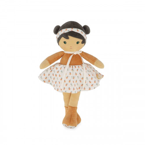 Meet Eloise, the charming 32cm fabric doll with a rustic, summery look. From Kaloo's Tendresse doll collection, she's suitable for babies from birth. Her two little buns give her a mischievous air, embodying the joy and sweetness of childhood! She takes us to a tender, bucolic world of walks and daydreams under apple trees. Eloise wears a pretty corduroy top, adding a touch of elegance. Her lovely chiffon skirt, adorned with fruity patterns, evokes the warmth of sunny days and the pleasures of harvesting under the sun. Matching little booties allow her to stroll comfortably in the sunshine! A delicate headband, matching her skirt, highlights her double buns, enhancing her cheerful and sparkling appearance! Incredibly soft, she's perfect for little ones to hold and cuddle. Easy to take everywhere, Eloise accompanies children on their most tender adventures. Always ready to share everyday moments, she becomes a true playmate and cuddle buddy. Eloise evokes the spirit of days in the countryside: those spent lying in the grass watching the clouds and picking ripe fruit in the sunshine. A small sewn ribbon on her back allows you to write the baby's name, making her a unique and precious friend. Presented in a pretty box, she is an original baby gift, full of sweetness and poetry. She is also perfect as a first doll to stimulate little ones' imaginations. Carefully crafted, this fabric doll is made with at least 80% recycled materials, including its stuffing. Machine washable at 30°C, this adorable doll is ready to be adopted and loved for a long time!