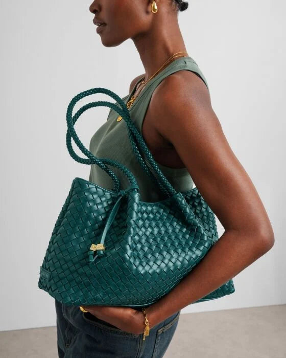 The Nova Small Shoulder Tote in Palm Green is perfect for lightweight summer styling. Featuring hand-woven vegan leather, a signature branded bag charm, and long comfortable handles that make it easy to carry over the shoulder. Complete with a secure magnetic closure, it adds a touch of understated elegance to any outfit.