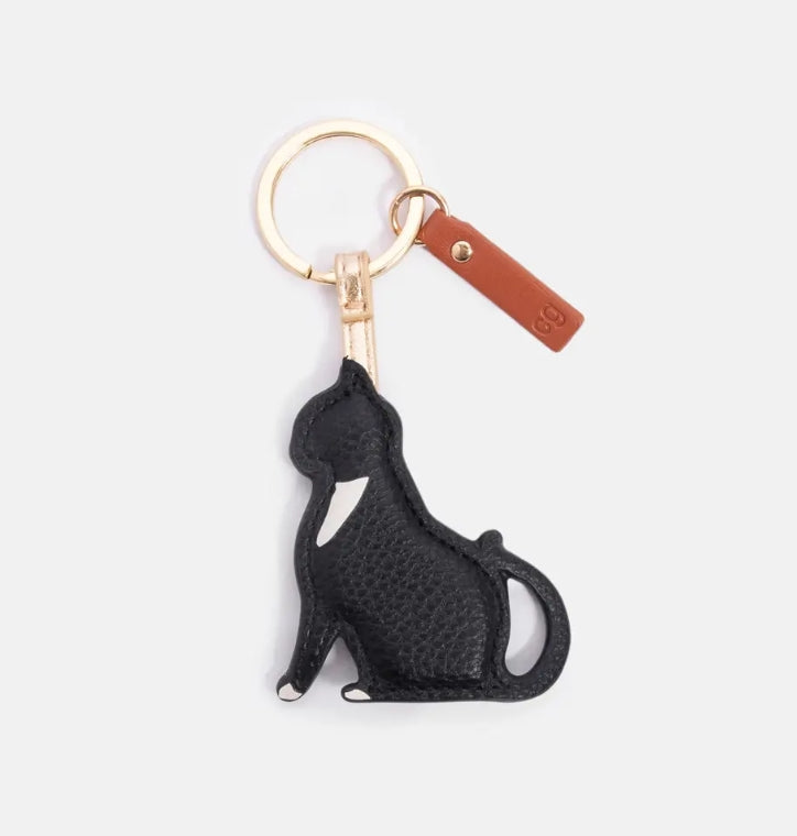 A leather look keyring in a charming tuxedo cat shape. Can be used as a traditional keyring or as a bag charm.