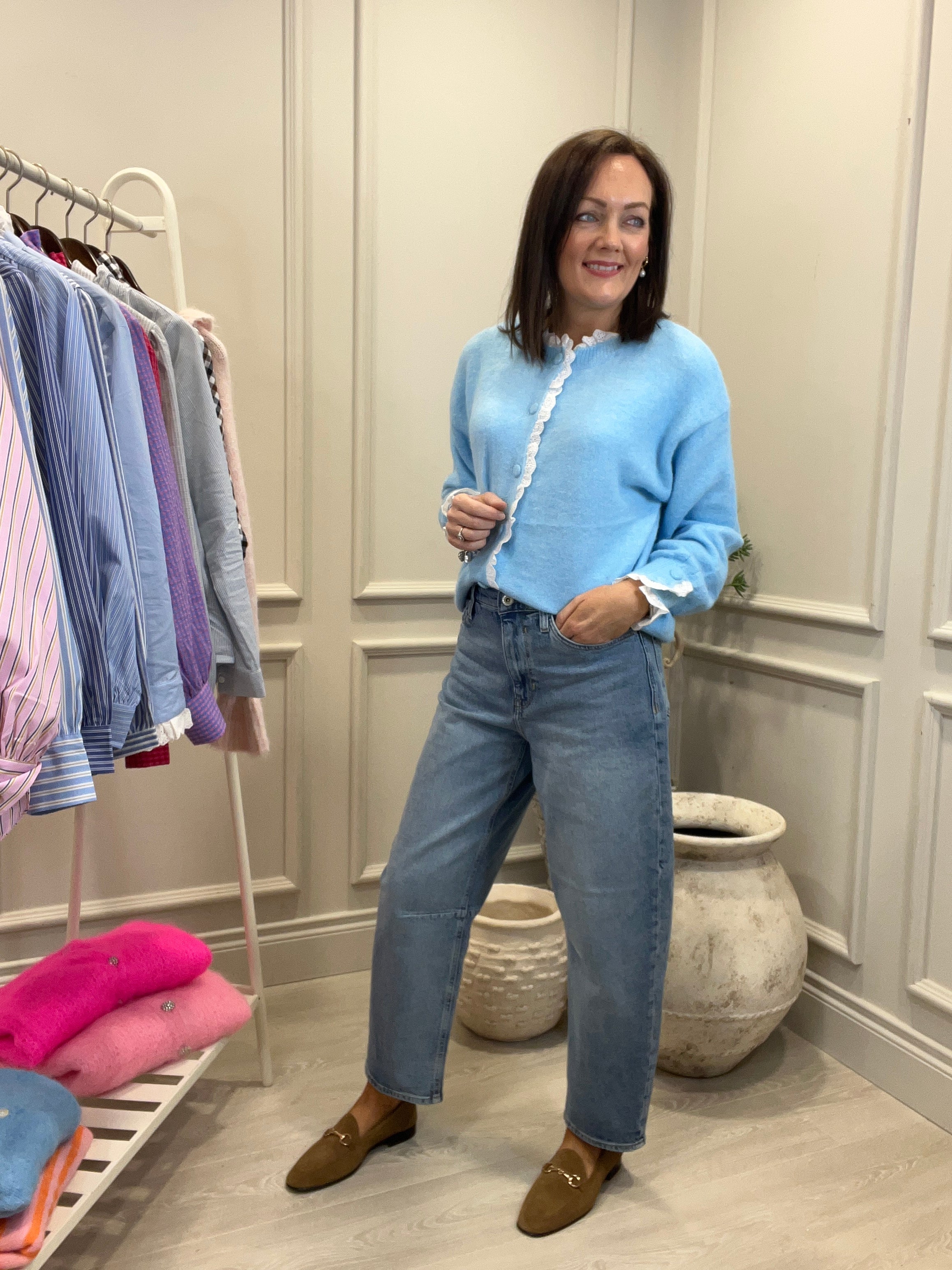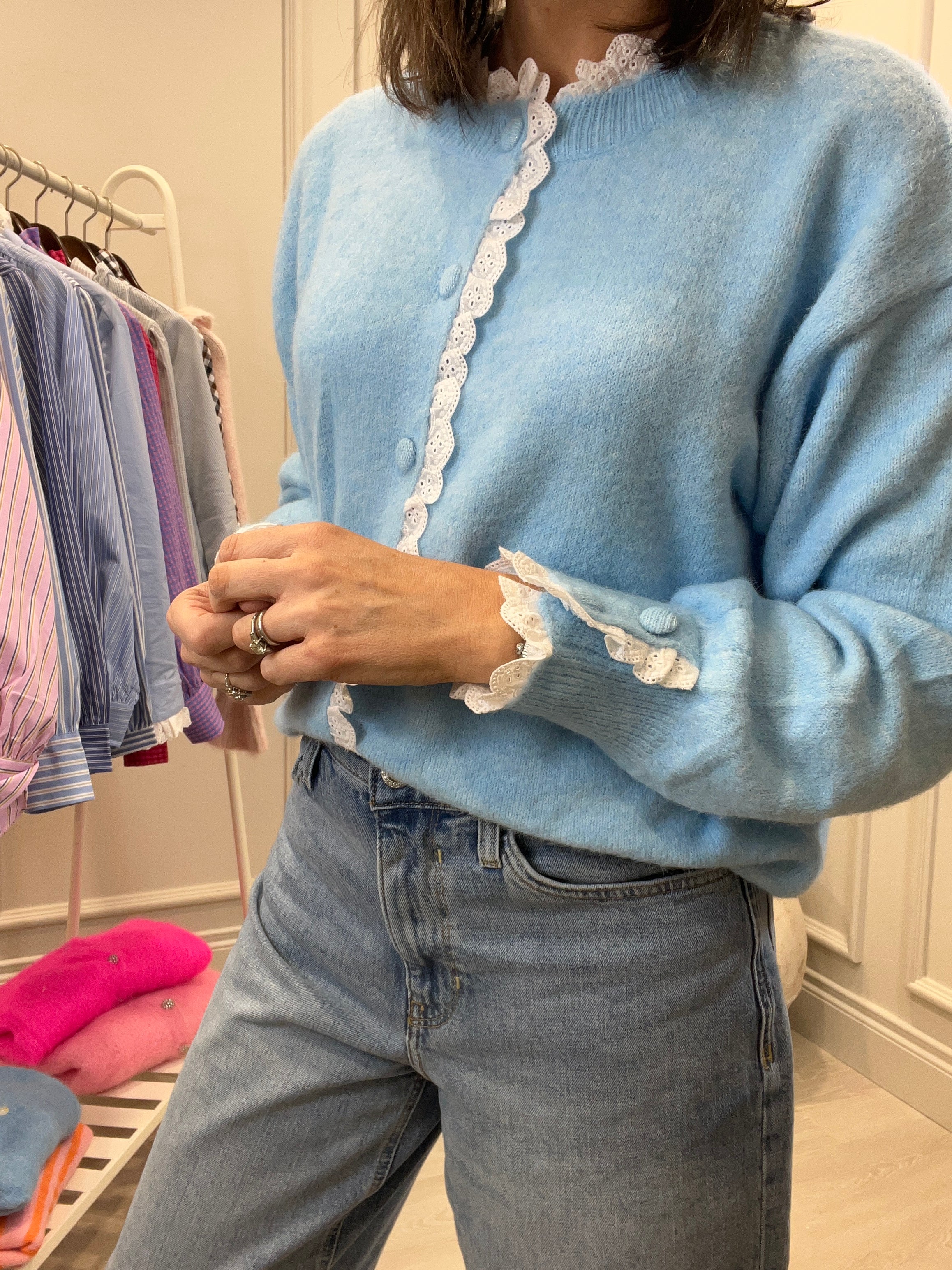 The delicate crochet details on this cardigan ensure a feminine and elegant look. We particularly love the cuff detail. Soft and cosy for cool spring days.